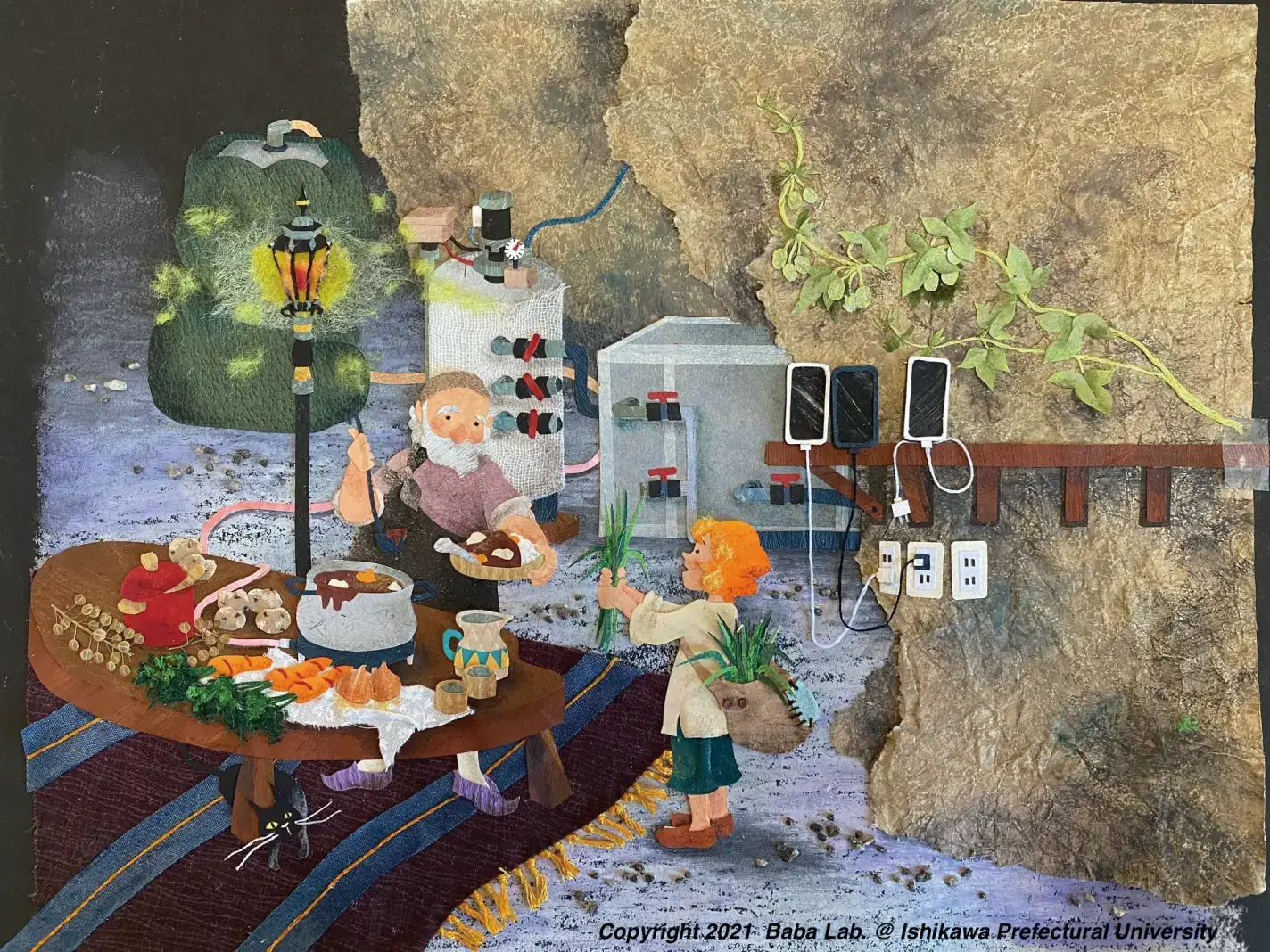 男の子が雑草を摘んできて、おじいさんに渡します。おじいさんは、後方に設置されたエコスタンドアロンに雑草を投入し、メタンガスをつくります。そのメタンガスで温かいカレーライスを炊き出し、男の子に手渡します。おじいさんの左にはメタンガスで夜の明かりをともし、男の子の右側には、メタン発電スマートフォンが充電されています。2011年の震災で経験した「あたたかいご飯」「夜のあかり」「携帯電話の充電」を雑草で解決する。こんな願いが込められています。
